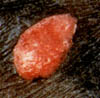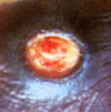 | Third Degree (Full-thickness burn) Epidermis, dermis and epidermal appendages destroyed, injury through dermis. Wound appears dry, leatherlike; pale, mottled brown or red; thrombosed vessels visible; insensate. | ![]() |